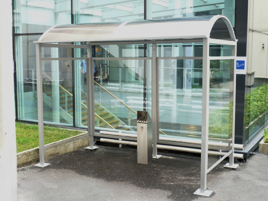 Indépendamment de leur profession, de nombreux fumeurs se trouvent dans les établissements et nécessitent un espace fumeur adéquat. Un abri fumeur a été installé près du hall d'accueil, sur la terrasse surplombant le parking de l'entreprise.