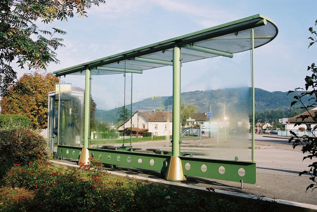 Cette installation met en valeur l'abri bus Héritage, dans sa version 6 m. Pour accentuer l'effet de Marquise, en rappel à l'histoire, le coloris vert amande renforce l'identité du produit. L'intégration des cônes décoratifs personnalisés, de couleur doré, contraste l'ensemble du mobilier.