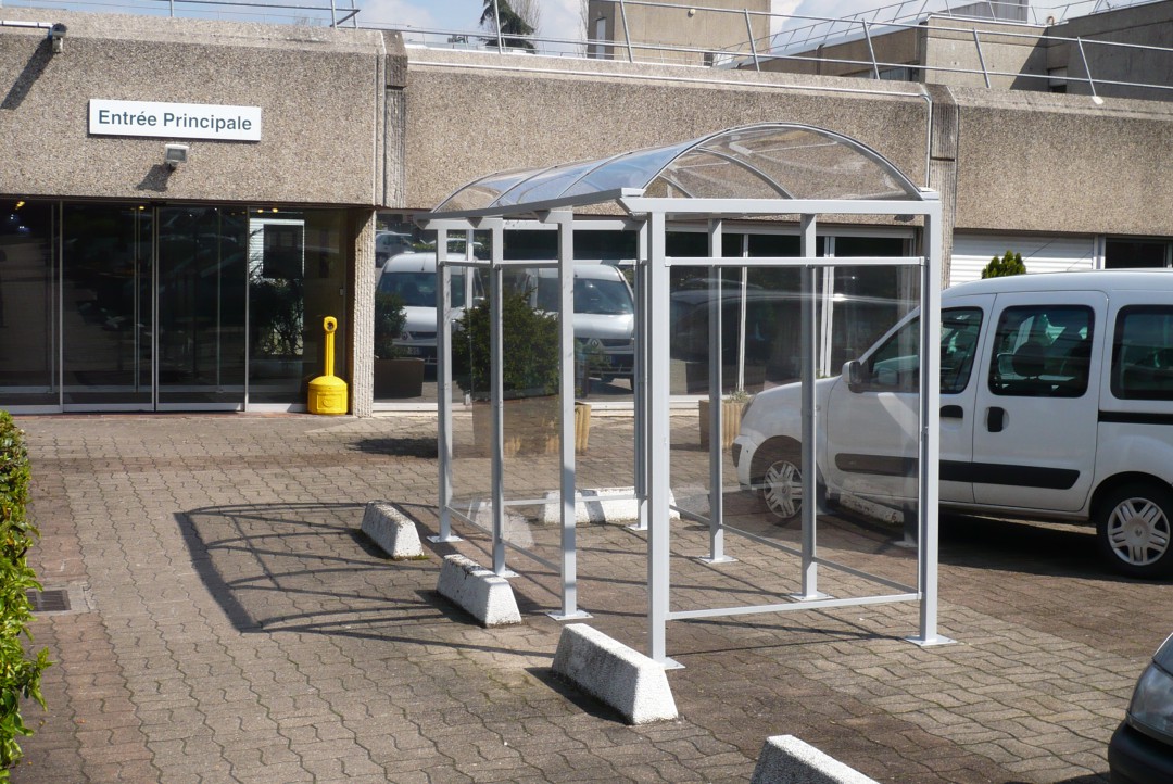 À la demande du client,l'abri fumeurs Vision est équipé de parois latérales en polycarbonate.
