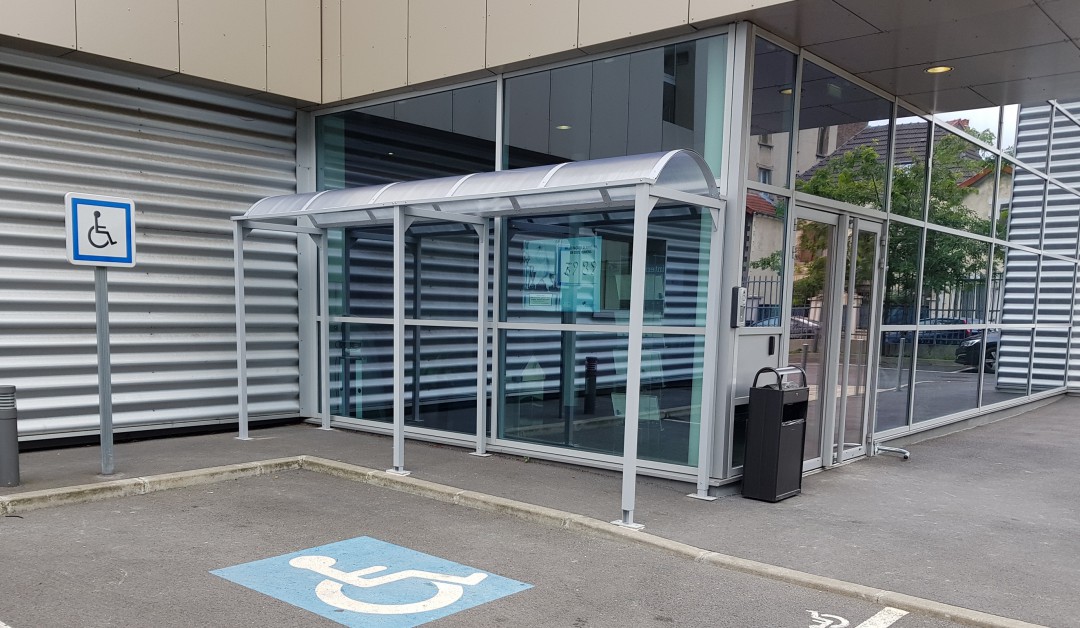 La société INTERXION, spécialisée dans traitement de données, et l' hébergement et activités connexes, dont un établissement est situé à Aubervilliers, en pleine zone d'activité, a décidé de mettre à disposition de ses salariés un abri fumeurs à la sortie du hall d'accueil. Malheureusement, par la présence des parkings, l'exiguïté du lieu ne permettant pas d'installer un abri fumeurs imposant, INTERXION a refait appel à notre société pour installer un abri sur mesure situé entre le parking et le hall d'accueil. Réalisé à la demande il couvre la surface disponible du sol pour une longueur de 5 m x 1,40 m.